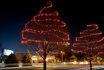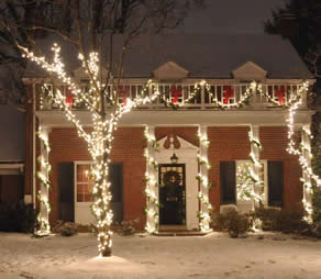 christmas light installation buisness, the roof line is decorated with frosted white,  C-9 (large bulbs), the columns are wraped with green garland and white mini lightys, the trees are trunk and canopy wraped with various colors of mini lights